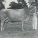 National Dairy Cattle Congress. Brown Swiss Cow. Straw. Cow blanket that says: "West Lawn Farm, Sarona, Wisc." Banner says: "Mother of the All." Another sign that looks like a book says: "Family Album, Cobby's Fidelia of West Lawn, 12930, Age: 15 yrs, 5 months; classified: 'Good Plus'; 11 Registered Offspring; Best Record: 365 days, 17,521# milk, 6697# fat; Total Lifetime Production: 3790 days, 122,066# milk, 47479# fat." Grout Museum District. Additional photographs and artifacts can be found on the Grout Museum Districts online collections website at https://gmdistrict.catalogaccess.com/