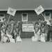 National Dairy Cattle Congress. Grounds Folder 2. Group portrait of youth holding signs and trash bags. The sign on the fence reads, "Litter picked up by metro youth, 1977 Cattle Congress." They are standing in front of a brick building.