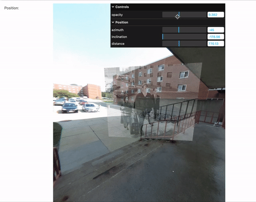 A user uses the controls in the upper righthand corner (opacity, azimuth, inclination, and distance) to precisely position an historical photo against the 360º image. You can share any FotoSphere with a link, or embed a FotoSphere into another website.