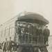 Photo on postcard. Group portrait of 2 men standing on the ground and 7 men standing on the back of the train car.